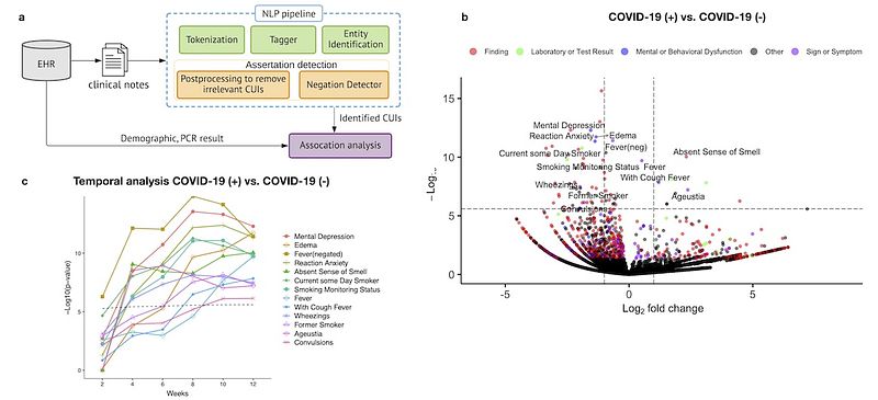 Results: We processed 87,753 notes 19,692 patients (1,483 COVID-19-positive) subjected to COVID-19 PCR testing between March 8, 2020, and May 27, 2020. We identified symptoms associated with increasing risk of COVID-19, including “absent sense of smell” (odds ratio [OR] = 4.97, 95% confidence interval [CI] = 3.21–7.50), “fever” (OR = 1.43, 95% CI = 1.28–1.59), “with cough fever” (OR = 2.29, 95% CI = 1.75–2.96), and “ageusia” (OR = 5.18, 95% CI = 3.02–8.58). Using ConceptWAS, we were able to detect loss of sense of smell or taste three weeks prior to their inclusion as symptoms of the disease by the Centers for Disease Control and Prevention (CDC).